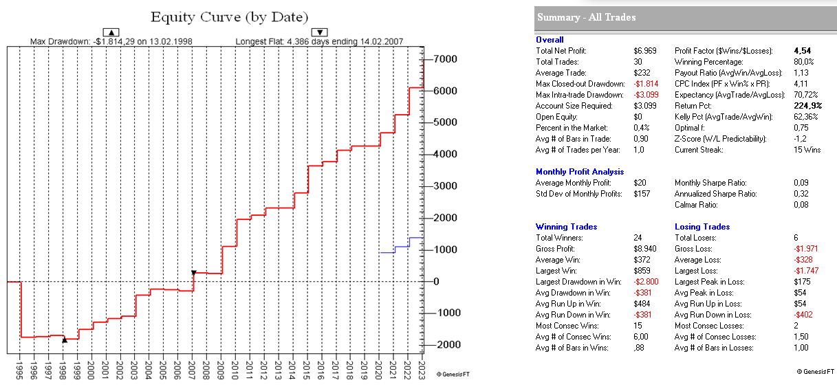 Und hier haben wir die Kapitalkurve einer Strategie, die eine Trefferquote von über 80% aufweist und seit 1998 bis heute, wie an der Schnur gezogen performt. Es liegt ein simpler, starker Basiseffekt vor, so dass die Stetigkeit in der Equity von dem fundamentalen Effekt stammt. Es wurden keine zusätzlichen Filter oder Bedingungen eingebaut!!