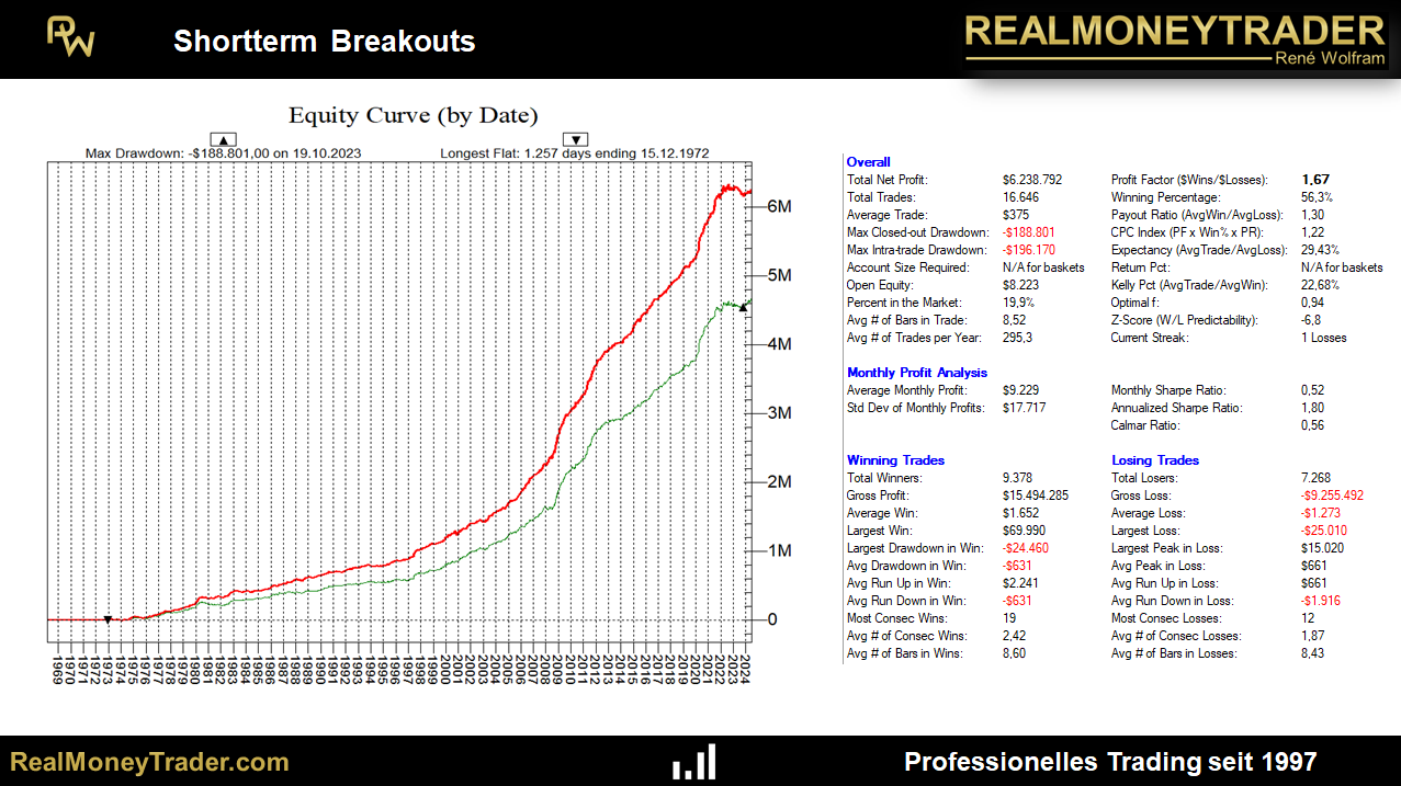 Die PowerBreakouts sind DIE Revolution im Trend- und Ausbruchshandel, da sie KEINE diskretionäre Komponente beinhalten, sondern ein klares, einfaches Regelwerk. Sie sind zeitschonend umsetzbar und absolut planbar, da sie in konkreten, vordefinierten Zeitfenstern arbeiten. Auch die Haltedauer ist individuell präzise definiert. Weil hier Preis UND Zeit als kombinierte Faktoren eine Symbiose bilden, die an den fundamentalen Grundmauern des Marktverhaltens ansetzen, sind die Strategien über 5 Dekaden stetig positiv. Das findet man sonst fast gar nicht! Während die klassischen PowerBreakouts eine Haltedauer von mindestens 23 und maximal 46 Handelstagen haben, sind bei den SHORTTERM PowerBreakouts die Haltedauern zwischen 3 und 20 Handelstagen. Hier werden kurzfristige Ausbrüche aus spezifischen Handelstagen es Monats gehandelt. Während die klassischen PowerBreakouts jeweils nur einmal pro Jahr handeln, sind die SHORTTERM PowerBreakouts in jedem Monat anwendbar. So kann es zum Beispiel im S&P 500 in JEDEM der 12 Monate einen Trade an Handelstag drei geben, der 4 Tage gehalten wird, WENN der Preis über das Hoch von Handelstag 2 ansteigt. Die SHORTTERM PowerBreakouts bilden eine perfekte Ergänzung zu den klassischen PowerBreakouts, weil sie kurzfristiger agieren. Die Performance über 5 Dekaden ist aber ganz ähnlich, wie bei den klassischen PowerBreakouts. Die Kapitalkurve des 64 Setups umfassenden Portfolios ist sehr stetig, wie wir im historischen Equity-Verlauf sehen.