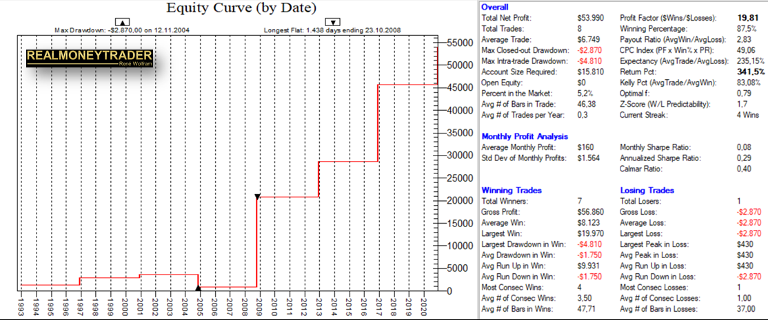 Wie mächtig und bedeutend die Effekte des US-Wahlzyklus (Election Cycle) sind, spiegelt sich in den Performance-Kennziffern des Trade-Portfolios wider. Es sind insgesamt 32 Setups, die ein konkretes Einstiegs- und Ausstiegsdatum, sowie einen fest zugeordneten Stop-Loss und teilweise ein Ziel (Take-Profit) haben. Damit ist die Umsetzung kinderleicht und für jeden, unabhängig vom Erfahrungsgrad duplizierbar. Mit nur 431 Trades wurde ein Gewinn (nach Gebühren) von 1.278.925 Dollar (also fast 1,3 Mio Dollar) erzielt. Die Trefferquoten liegen für viele dieser Setups sogar bei 75 bis 100%! Die Profit Factors gehen regelrecht durch de Decke und bewegen sich vielfach im Bereich um 20 (bereits ein PF von 2 ist sehr gut) und bei einigen Trades sogar 999!