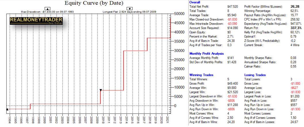 Die Strategien sind einfach und präzise definiert (Einstiegs-Termin, Ausstiegs-Termin, Stop-Loss in % und ggf. Ziel in Prozent).