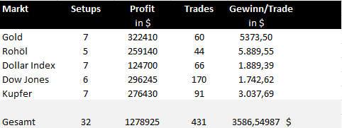Insgesamt schulen wir in unserem Thementags-Seminar 32 Setups, die in Gold, Dow Jones, Kupfer, Dollar und Rohöl gehandelt werden. Hier nur einige Kapitalkurven, damit sie einen Eindruck bekommen, welch enorme Profitabilität mit diesen zyklisch basierten Trades erzielt werden kann.