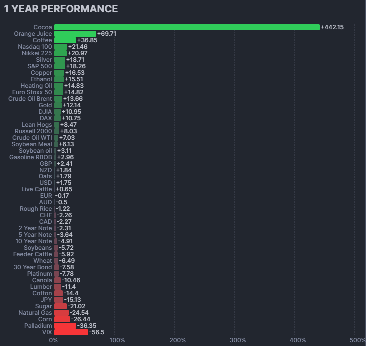 Als Trader benötigst Du Bewegung im Markt, damit Du Gewinne erzielen und Dir ein Vermögen aufbauen kannst. Interessanterweise sind die meisten privaten Trader jedoch primär in genau den Märkten aktiv, die sich am wenigsten bewegen – zum Beispiel in den Währungen. Wer verstanden hat, dass es Bewegung braucht, um Performance machen zu können, wird sich unweigerlich für Rohstoffe interessieren. Denn dort ist Bewegung garantiert. Betrachtet man allein die Performance der letzten 12 Monate, so sehen wir am oberen, wie auch am unteren Ende des Rankings Rohstoffe. Und deren Performances sind weit größer, als die der übrigen Märkte. Binnen eines Jahres hat der Kakaopreis um 442% zugelegt, Orange Juice um knapp 70% und Kaffee immer noch um 36,85%. Palladium, Mais und Erdgas haben sich gedrittelt bzw. geviertelt. In Rohstoffen kann also schnell viel verdient werden. Allerdings braucht es dafür ein fundamentales Verständnis, sowie ausgearbeitete Strategien, da man sonst auch schnell viel verlieren kann.