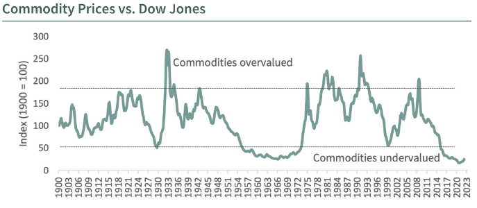 Wer denkt, die Rohstoffe wären nur mal für ein paar wenige Jahre spannend, irrt gewaltig. Ich wurde jüngst bei einem Rohstoff-Symposium gefragt, ob Rohstoffe nicht bereits ihre spannendste Phase hinter sich hätten. Aus meiner Sicht ganz klar nein! Betrachtet man sich das Verhältnis von Aktienmarkt zu Rohstoffen, so sind wir eher im Anfangs-, denn im Endstadium. Aktuell liegt zum Beispiel die Stocks/Commodity-Ratio, bemessen am Verhältnis des Dow Jones zum Goldman Sachs Commodity Index (GSCI) bei 69. Damit sind wir gerade frisch aus der Undervalued-Zone heraus, und haben noch viel Luft nach oben. Rohstoff-Bullenmärkte endeten stets mit einer Ratio von 200 und mehr!