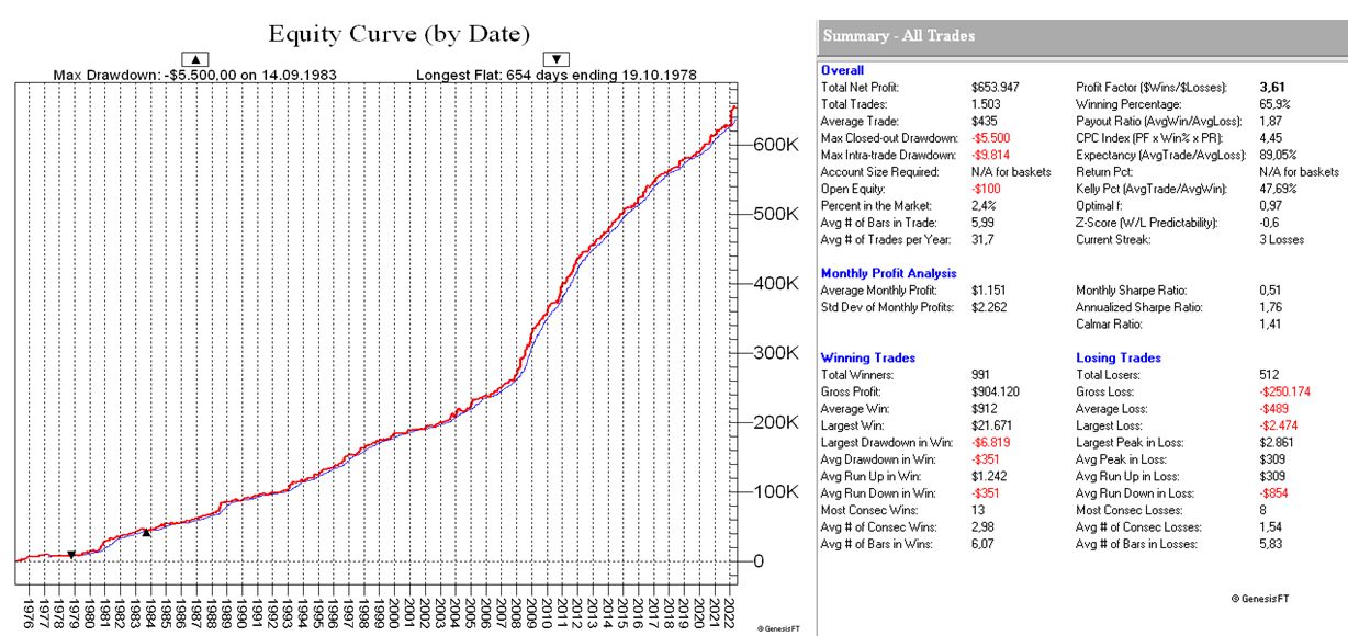 Über 52 Jahre wurde ohne Zinseszins-Effekt die folgende Kapitalkurve mit dem Portfolio dieser 35 Setups erzielt. 653.947 Dollar Gewinn wurden mit einer maximalen Schwankung von 9.814 Dollar erzielt! Um es noch einmal klar zu sagen: mehr als 9.814 Dollar schwankte das Konto zu keiner Zeit!!! Dabei war das Kapital nur in 2,4% der Zeit dem Marktrisiko ausgesetzt und stand die restliche Zeit für andere Engagements zur Verfügung. 65,9% Trefferquote machen den Handel sehr angenehm.