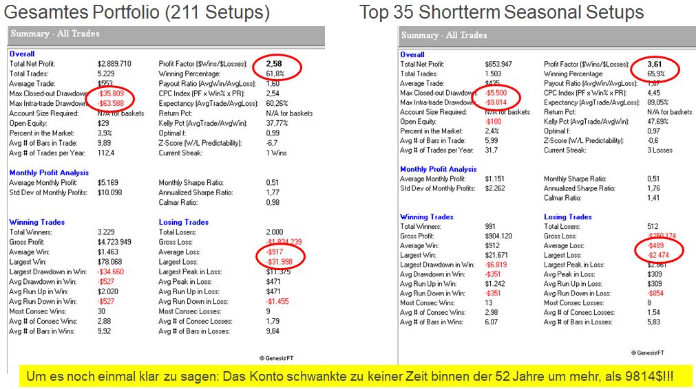 Die Shortterm Seasonals sind rein saisonal basierte Trades, die eine Haltedauer von 3 bis 20 Handelstagen haben. Jedem Trade sind ein klares Einstiegs-Regelwerk, ein fest definierter Stop und ein Ausstiegs-Termin zugeordnet, so dass die Umsetzung sehr einfach und mit jedem Produkt möglich ist. Die 35 hier geschulten Setups stammen aus dem insgesamt 211 Trades umfassenden Portfolio der Shortterm Seasonals und sind jene 35 mit dem über 5 Dekaden geringsten Draw Down. Nachfolgend stellen wir die Kennziffern des gesamten Portfolios (211 Trades) und dem 35 Setups umfassenden Low Draw Down Portfolio gegenüber. Der Profit Factor geht von 2,58 auf 3,61 rauf, die Trefferquote steigt von 61,8 auf 65,9%. Am wichtigsten für die praktische Umsetzung ist jedoch der Draw Down. Der maximale Intra-Trade Draw Down (Kontoschwankung während Trades laufen) sinkt von 63.588$ auf 9814$!!! Das ist eine herausragend geringe Schwankung. Der größte Einzelverlust (largest Loss) sinkt von 31.998$ auf 2.474$.