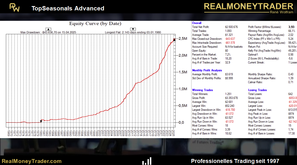 Einige nutzen bereits erfolgreich saisonale Strategien aus unserem Hause oder Breakout- und Daytrading-Strategien. Nun schulen wir zum ersten Mal seit Juni 2024 wieder unser Seasonals Advanced Portfolio, welches 44 saisonal basierte Trades beinhaltet, die herausragende Performance-Kennziffern aufweisen. Das Portfolio hat allein seit 1990 2,1 Millionen Dollar OHNE Wiedereinsatz verdient. Dabei lag die Trefferquote bei angenehmen 66,1%, der durchschnittliche Gewinn je Trade bei 1321 Dollar und der Profit-Factor bei einem herausragenden Wert von 3,93. Der maximale Draw Down lag über den gesamten Zeitraum bei niemals mehr, als 61.578 Dollar! Alle Zahlen beziehen sich auf einen Kontrakt standardmäßigen Einsatz. Natürlich kann für kleinere Konten herunter- und bei einer größeren Kapitaldecke herauf skaliert werden.