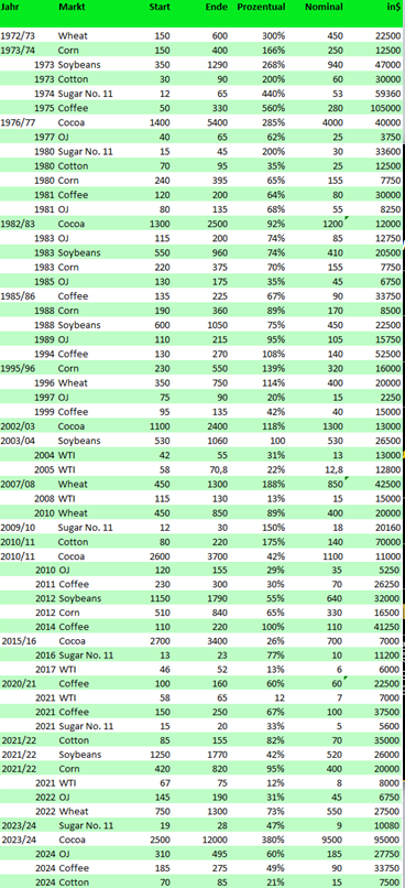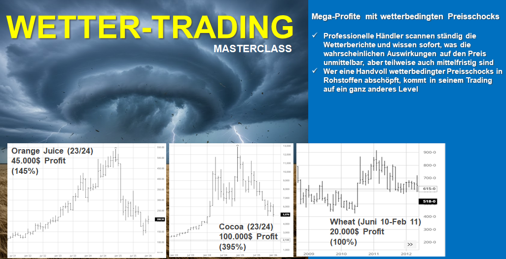 Mit unserem Paket WETTER-TRADING MASTERCLASS vermitteln wir auf einfache und verständliche Weise Wissen, das die Teilnehmer in die Lage versetzt, ihr systematisches Handeln um eine dynamische, auf den Wetter-Ereignissen beruhrende Strategie zu erweitern. Immer wieder wird man so binnen weniger Wochen und Monate Preisbewegungen von 20, 50 bis hin zu 500% handeln und sich ein großes Stück der Bewegung herausschneiden können. Alle Wetter-Ereignisse von 1972 bis einschließlich 2024, standardmäßig mit einem Kontrakt gehandelt, haben 1,4 Millionen Dollar Profit und sage und schreibe 23.625$ durchschnittlich pro Trade gebracht.