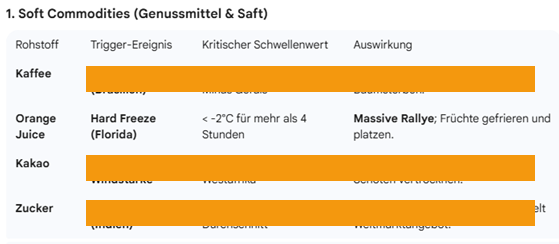 Für Dich als Trader oder Traderin ist wichtig, keine schwammigen und interpretationswürdigen Regeln an die Hand zu bekommen, sondern ganz klare quantifizierbare Triggerwerte. Und genau die bekommst Du in unserer WETTER-TRADING MASTERCLASS. Ein Beispiel illustriert dies für Orange Juice (die anderen Triggerwerte und Handlungsstränge haben wir übermalt, da sie exklusiv im Seminar offengelegt werden. Bei Orangensaft ist die Triggerschwelle einfach und ohne Interpretationsspielraum: Temperaturen < -2 Grad Celsius in Florida für mehr als 4 Stunden. Die Temperatur dort kannst Du frei auf jeder beliebigen Wetterseite oder auch einfach via Google jederzeit abrufen. Diese Trigger-Tabelle haben wir für alle Soft-Commodities, Getreide, aber auch für die Energie-Rohstoffe (die auch wettersensitiv sind).