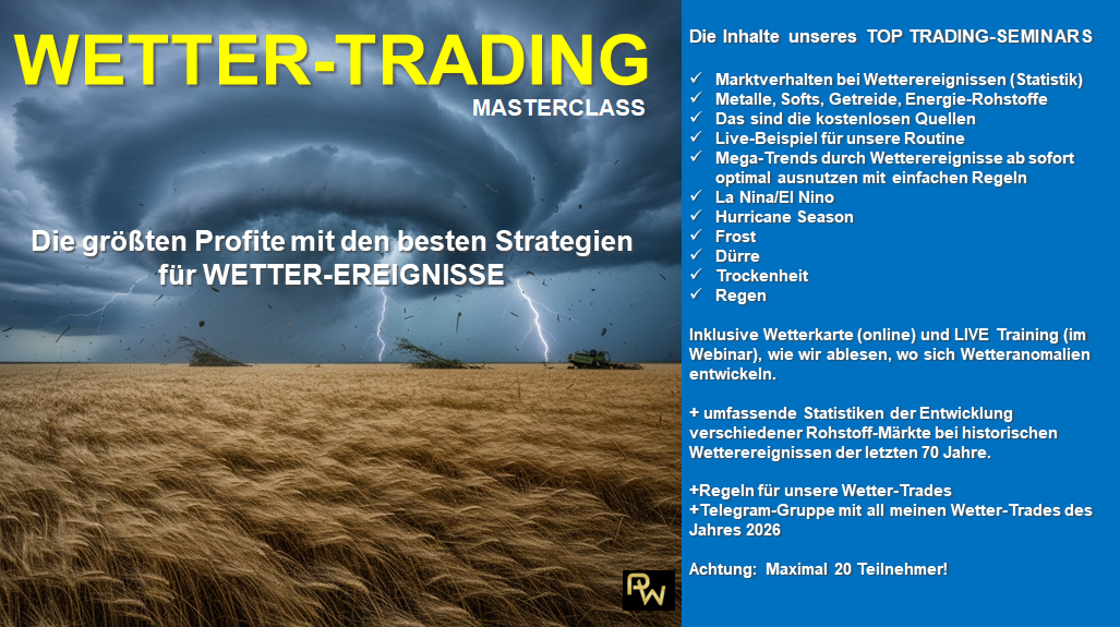 Mit unseren systematischen Trades haben wir einen festen Zeitfilter, der natürlich auch in für einen Preisschock wahrscheinlichen Phasen handelt. Wir werden also auch mit den bekannten Systematiken, wie den RW Miracles Breakouts, den PowerBreakouts und den Saisonalen Strategien immer wieder einen Teil der extremen wetterbedingten Trends abschöpfen. Doch die WETTER-TRADING MASTERCLASS geht noch viel weiter und vermittelt Dir Hintergrundwissen und die Fähigkeit, solche Trends besser auszureizen und Dir einen großen Teil des Potenzials heraus zu schälen. Auch treten Wetter-Extreme manchmal in Zeitfenstern auf, in denen unsere herkömmlichen Systematiken nicht handeln.