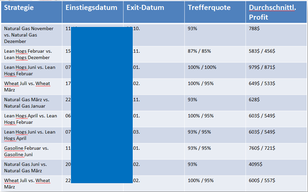 Ich nutze insgesamt 60 Spread-Setups, die ich alle im Rahmen unseres Thementag-Seminars (online) vermittele. Im Seminar selbst werde ich die fundamentalen Hintergründe erklären, sowie Schritt für Schritt zeigen, wie man einen Spread-Trade eröffnet und schließt. Im Seminar wirst Du fit für Spread-Trading gemacht, so dass keine Fragen mehr offen bleiben. Gemeinsam mit der Video-Aufzeichnung händige ich Dir die vollständigen Unterlagen aus, die auch eine tabellarische Übersicht mit den Ein- und Ausstiegsterminen der Trades beinhalten, sowie deren Trefferquote. Für die Intermarket-Spreads zeige ich live, wie die Charts erstellt werden (ich mache es in der Tradingview-Software) können.