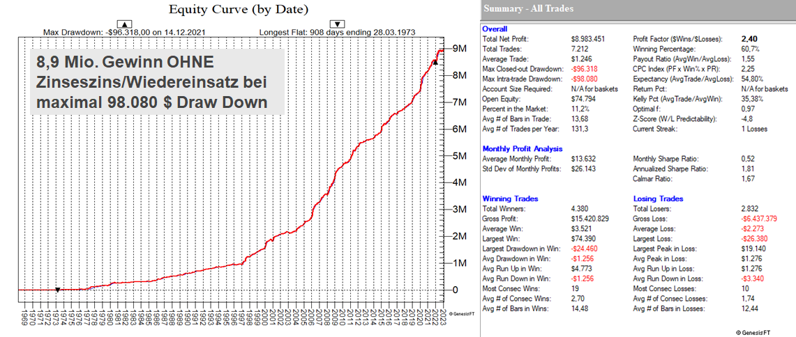 Erstmals und auch einmalig wird am 26.02.2023 in einem Exklusiv-Seminar (online) unser High-Profit-Portfolio geschult. Es setzt sich aus den gewinnträchtigsten Setups zusammen und hat in der Historie OHNE Wiedereinsatz der Gewinne 8.93 Millionen Dollar Gewinn nach Gebühren erwirtschaftet. Wer den Ansatz mit Futures umsetzen möchte, sollte ein Startkapital von 150k Dollar veranschlagen. Das Tolle an dieser Portfolio-Zusammensetzung ist jedoch, dass nicht nur alle Setups auch mit CFD´s umsetzbar und damit skalierbar für kleine Konten sind, sondern dass es für alle gehandelten Märkte auch Hebelzertifikate gibt. Wer also mit einem kleinen Konto zu starten gedenkt, kann alles auch wahlweise mit CFD´s oder Hebelzertifikaten umsetzen.