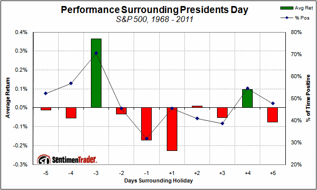 Der eindeutig schwächste Tag um den Presidents Day herum ist der erste Handelstag nach der feiertagsbedingten Pause, also der Dienstag. Shortpositionen, die im Vorfeld des Feiertages eröffnet wurden können zum Handelsende des ersten Tradingtages nach dem Feiertag geschlossen werden.