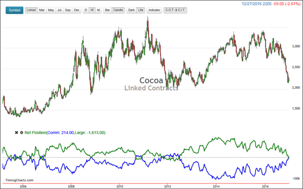 Aktuell sind auf Basis der CoT-Daten u.a. Crude Oil für die Shortseite und Cocoa für die Longseite einen Blick wert. Doch Crude Oil kann m.E. noch bis 58/63 Dollar ansteigen, ehe die Reaktion kommt und bei Cocoa sind die produzentendominierten Commercials zwar sogar netto-long, doch kann auch hier der Preis noch schwanken, ehe der Anstieg einsetzt. Da die Commercials praktisch spiegelbildlich zu den Fonds agieren und mit einem höheren Grad an Spekulation im Markt auch stärker absichern (und umgekehrt), ist es clever, bei der vorliegenden Situation im Cocoa-Future nicht sofort blind „Long“ einzusteigen, sondern zu warten, bis sich der Kapitalstrom umkehrt. Derzeit kaufen die Commercials und lösen damit Absicherungen auf, weil das Pendant, die Large Traders (Fonds) immer stärker verkauft (Short ist). Irgendwann müssen die Fonds ihre spekulativen Positionen beginnen zurück zu kaufen. Ein simpler, aber recht erfolgreicher Ansatz ist es dabei, zu warten bis die Netto-Position der Commercials erstmals wieder negativ wird. Denn das sagt dann zwangsläufig aus, dass die Fonds begonnen haben, ihre (Short-)Positionen zurück zu kaufen.