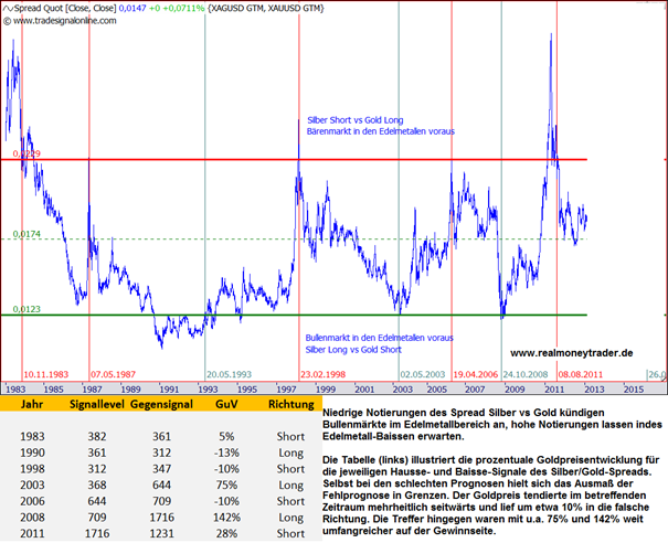 Selbstverständlich hat der Goldpreis mehrere Einflussfaktoren, die Beachtung finden können. Doch eine sehr hilfreiche und zugleich simple Methode, sich langfristig strategisch clever zu positionieren, ist die Betrachtung des Spreads zwischen Gold und Silber. Schlug die Preisratio zwischen dem gräulich und dem gelblich schimmernden Edelmetall am unteren Ende der historischen Bandbreite an, so standen die Edelmetalle vor einer Hausse und liefen im schlechtesten Fall seitwärts/moderat abwärts. Erreichte der Preisquotient zwischen Gold und Silber das obere Ende der langfristigen Range, so war man in der Historie gut beraten, seine Positionen drastisch zurück zu fahren und sich auf eine Korrektur in den Preisen einzustellen. Im besten Fall legte der Goldpreis um mehr als 140% nach einem Signal zu, im schlechtesten Fall lief er 13% gegen die Positionierung.